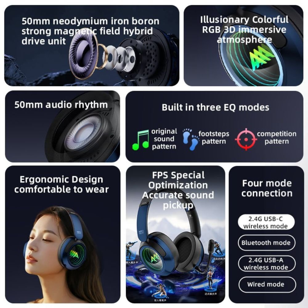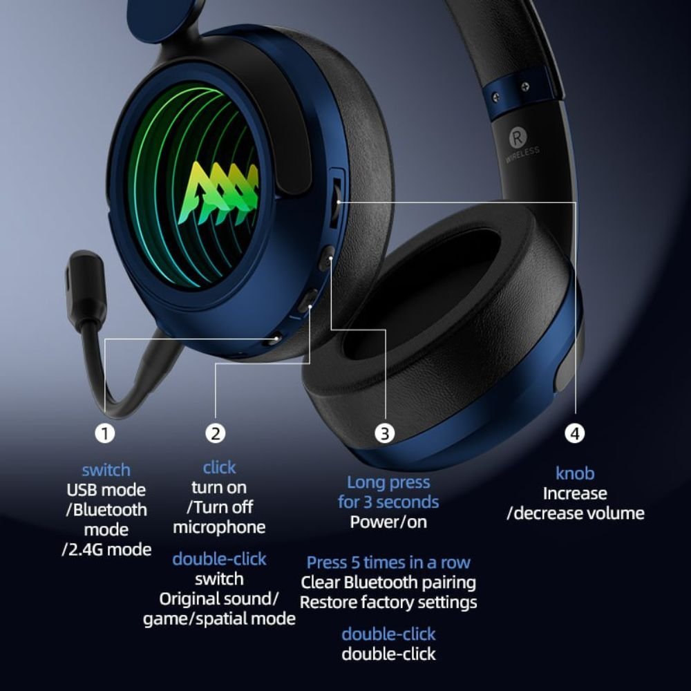 توفر السماعة 4 طرق اتصال مختلفة 🔌 لتعمل على جميع الأجهزة بسهولة، مع بطارية قوية تدوم حتى 120 ساعة 🔋 لتستمتع بجلسات لعب طويلة بدون قلق من الشحن.